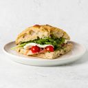 Fylt focaccia med spekeskinke, pesto, mozzarella og tomat og ruccola.