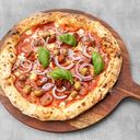 San Marzano tomatsaus, mozzarella Fior di latte, hermetisk tunfisk, rødløk, oliven, origano og basilikum.