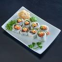 10 biter med kokt scampi, salat, kimchi, masago, koriander, chilimajones og sesamfrø. Rullet i rispapir. Serveres med ponzusaus.