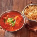 Stekt hjemmelaget ost tilsatt løk, tomater og sjampinjong i masalasaus.