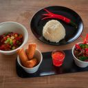 3stk vårruller, sprøstekt kylling med cashewnøtter og scampisuppe med kokosmelk.