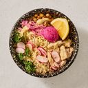 Serveres med kylling, hvitkål, syltet rødløk, quinoa, kikerter, reddiker, sitron, rødbethummus, nøtteparmesan og Cæsardressing. 826 kcal CO2-utslipp: 0,43 kg Allergener: Soya, Sennep, Cashewnøtter, Sesam, Gluten (hvete)
