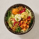 Serveres med salatblanding, rødkål, gulrot, brokkoli, reddiker, koriander, peanøtter, sesamfrø og peanøttdressing. 376 kcal CO2-utslipp: 0,40 kg Allergener: Sesam, Soya, Peanøtter