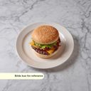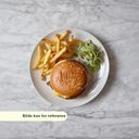 Homestyle burger serveres med cheddar, burger saus, tomat, salat, rødløk og sylteagurk. Toppet med løkringer. Serveres med pommes frites.
