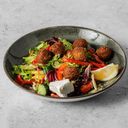 Salat med hjemmelaget falafel (kikerter), løk, tomater, fetaost, mango chutney dressing og brød.