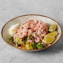 Salat med reker fra Engelsviken, mais, løk, tomater, egg, sitron, majonesdressing og brød.