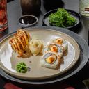 Fritert sushisandwich med grillet sataykylling, vårløk, avokado, hvit sesam og chilimajones Serveres med chilimajo og soyasaus.