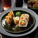 6 biter makirull med mango, fritert scampi, avokado, chilimajones og toppet med sabrura sushi krydder.
