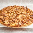 Pizza med sataymarinert kylling, paprika, rødløk, ananas, peanøtter og koriander.