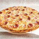Pizza med pepperoni, biff, skinke, løk og jalapenos.