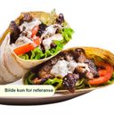 Ekte kebabkjøtt, salat, tomat, agurk, mais, løk, pommes frites og kebabsaus.