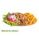 Kylling kebab, salat, tomat, agurk mais, løk, pommes frites og kebabsaus.