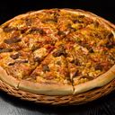 Pizza med saftig marinert biffkjøtt, pepperoni, skinke, baconterninger, kjøttdeig, løk og bakt sjampinjong.