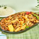 Velg mellom kyllingfilet eller biff med stekte grønnsaker. Serveres med ris og soyabønne saus.