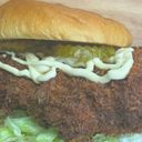 Serveres med aioli, panert kylling og syltet agurk. Toppet med vårløk.
