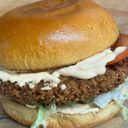 Burger med brioche burgerbrød, aioli, salat og syltet agurk.