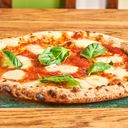 Porsjonspizza med fersk mozzarella, cherrytomater, burrata (kremet variant av mozzarella), parmaskinke, basilikum og extra virgin olivenolje.