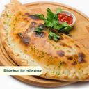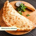 Innbakt pizza med kebabkjøtt, ost og tomatsaus.