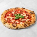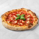 Pizza med san marzano tomater, fior di latte mozzarella, pepperoni og basilikum.
