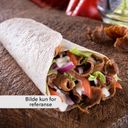 Kebab i rull med gyros, salat, tomat, løk, mais og saus.