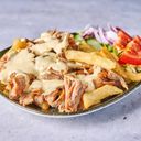 Pizza med tomatsaus, ost, gyroskjøtt, pommes frites og saus. Velg størrelse.