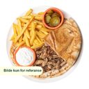 Kylling og lefse ferskt/saftig; men bare billige/få grønnsaker(mais, issalat), og selv om jeg valgte «sterk», var rullen mild. Tzatzikien, tahini-sausen og den røde spicy-sausen trenger forbedring.