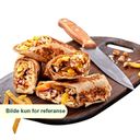 Marinert strimlet kyllingbryst stekt med paprika og løk. Serveres med salat, grønnsaker og dressing.