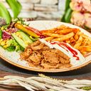 Kyllingtallerken med blandet salat, kebabsaus, pommes frites og brød.