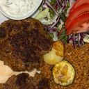 Kjøttdeig av lam og okse, stekt på spyd. Serveres med bulgur, salat, tzatsiki og pitabrød.
