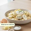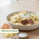 Stor porsjon pelmeni med kremet cottage cheese-fyll – perfekt å dele. Inneholder hvetemel, vann, cottage cheese, egg, salt, løk og krydder.