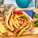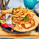 Gresk pitabrød med gresk salat, tzatziki og pommes frites. Velg mellom kylling eller svin.