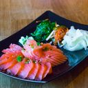 15 biter. Sashimi med laks, ris, kimchi, sjøgress og ingefær.
