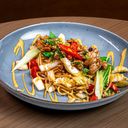 Kylling, nudler, pak choy, paprika, vårløk, sesamfrø, bønnespirer, sesammajones, teriyakisaus.