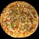 Pizza toppet med kebabkjøtt, løk, tomat og dressing. Velg størrelse.
