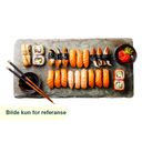 70 Biter. 4 personer. 8 laks maki, 8 kylling tempura maki, 8 laks crispy maki, 8 dragon roll maki og 24 nigiri.