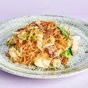Velg mellom kylling, biff eller scampi. Stekte risnudler med chili, babymais, gulrot, løk, Thai basilikum, paprika og langbønner. Denne retten er veldig sterk