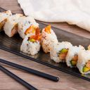 8 biter. Futo maki med fritert scampi, flyverogn, spicy majones, avokado og sesamfrø.
