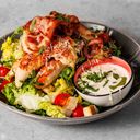 Salat med romano salat, bacon, krutonger, cherrytomater, parmesan og klassisk cæsar dressing. Velg mellom laks eller kylling.