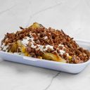 Ekstra mengde sprøstekt bacon, rømme, mais og ost.