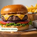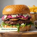 Saftig og smakfull vegetar burger laget av plantebaserte råvarer. Serveres i mykt burgerbrød med frisk salat, tomat, syltet rødløk og husets dressing. Et mettende og godt alternativ uten kjøtt.