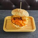 Hamburger med coleslaw, løkringer, 3 x bacon, cheddarost og BBQ-dressing.