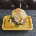 Burger med salat, tomat, rødløk, sylteagurk, bacon, cheddarost og husdressing.