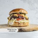 Burger med bacon, agurk, løk, salat, tomat og dressing. Serveres med pommes frites og valgfri 0,5l mineralvann.