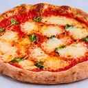 Pizza med mozzarella, basilikum, tomatsaus og olivenolje.
