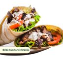 Rull med kebabkjøtt, salat, tomat, rødløk, agurk og dressing. Velg størrelse.