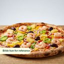 Pizza med prawn, purre, rødløk, mais, ananas, paprika og oliven.