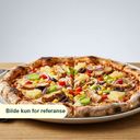 Pizza med skinke (kylling), bacon (kalkun), pepperoni (kylling), rød løk, purre, paprika, mais, ananas og oliven.