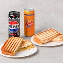 Serveres med 2 toast og 1 drikke.