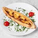 Manakish med marinet kylling, ost og saus.