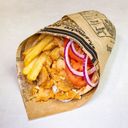 Kyllingkjøtt, tomater, rødløk, tzatziki og pommes frites pakket inn i varm pita.
